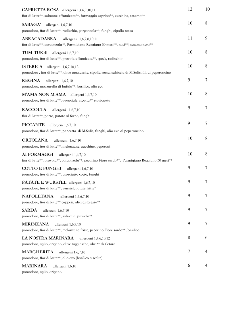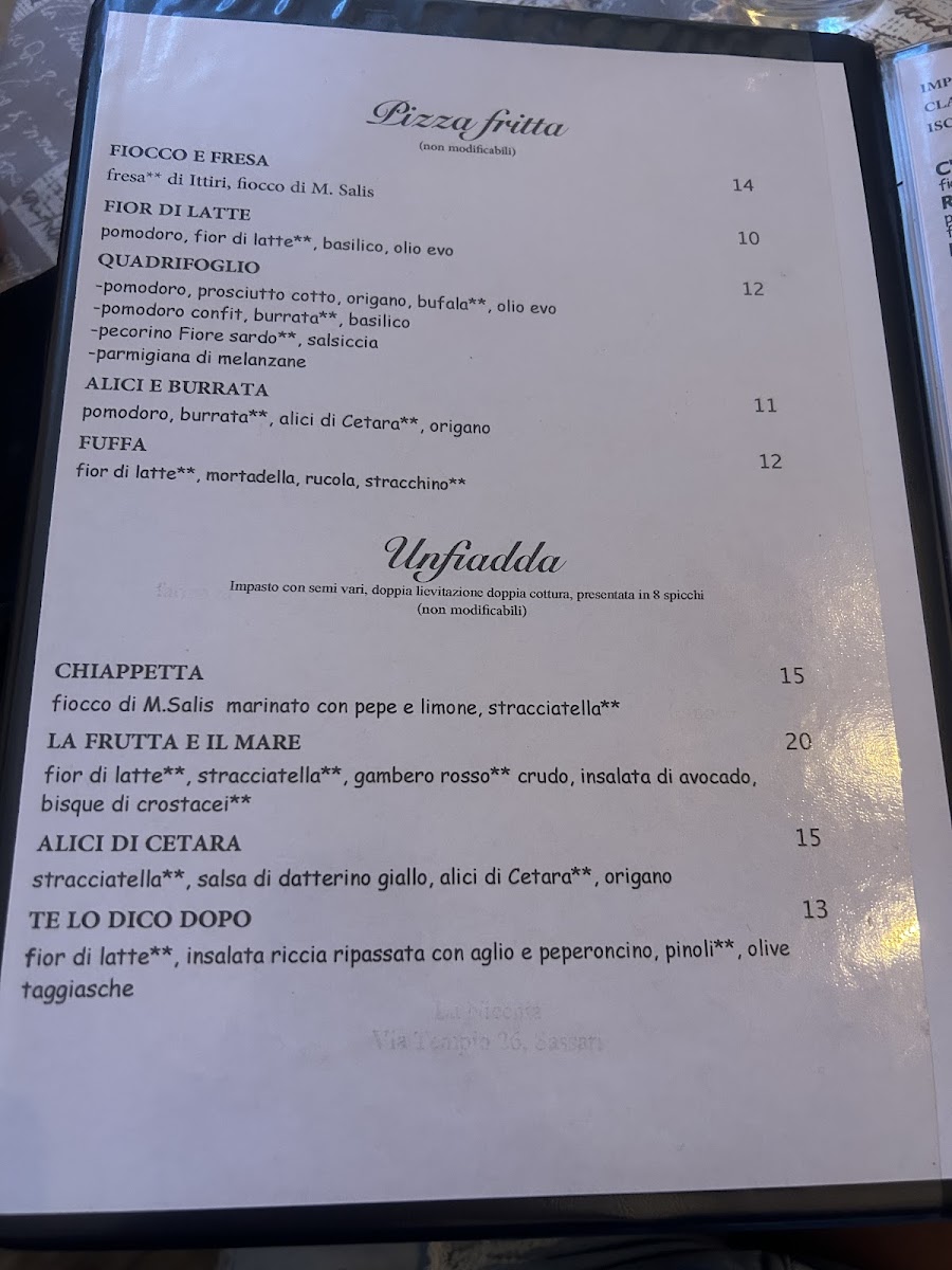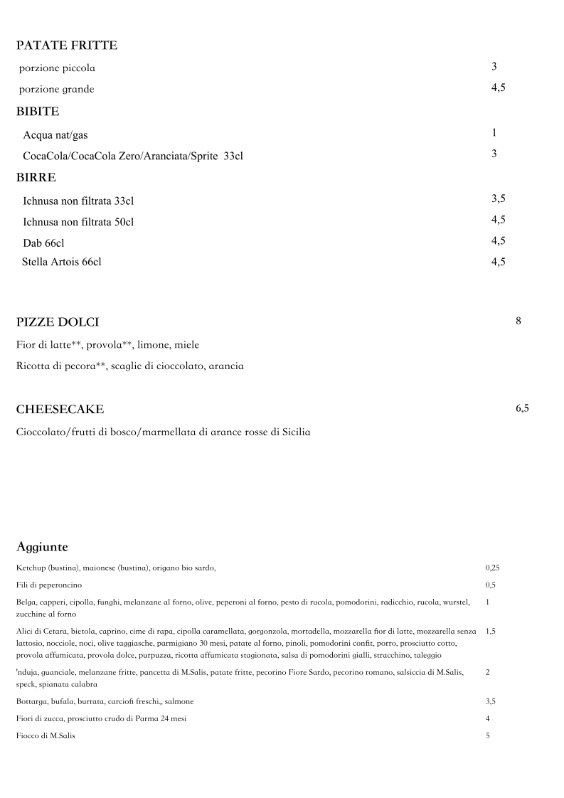 The menu features a range of pizzas that highlight fresh, local ingredients and seasonal flavors. Guests can enjoy classic options like Pizza Napolitana or explore unique creations such as the Pizza Fritta Quadrifoglio and Pizza Con Pomodorini E Scaglie Di Bottarga. Alongside these, there are complimentary small plates like Melanzane Fritte Funghi Gorgonzola E Provola or the traditional Sardinian bread, making it easy to indulge in bites that complement the main dishes.